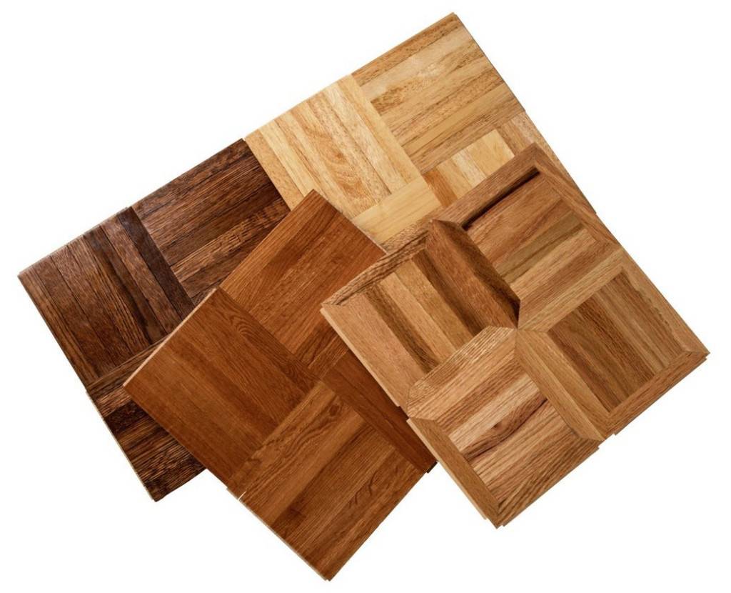 Наборный или мозаичный паркет – небольшие квадратные щиты, собранные из мелких массивных планок. Лицевой стороной они наклеиваются на специальную плотную пленку, которая удаляется вместе с клеем после настила покрытия. На обратной стороне щитков закреплен слой звукоизоляционного материала (резина, пенопласт). Габариты: длина – 40 или 60 см; ширина – 40 или 60 см; толщина – 8-12 мм; глубина рабочего слоя – до 2-5 мм.