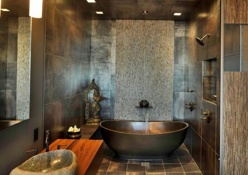 А это красивая овальная ванна. Она отлично сочетается с коричневым полом и с привлекательными предметами декора.