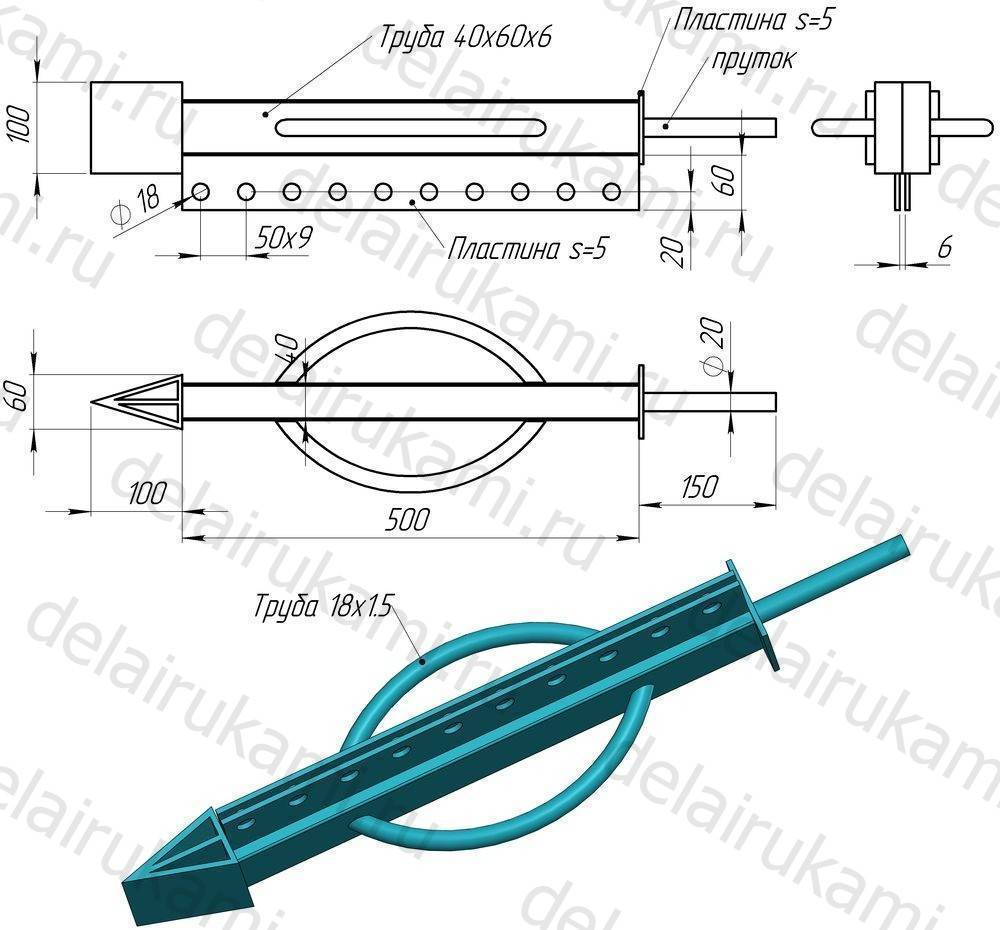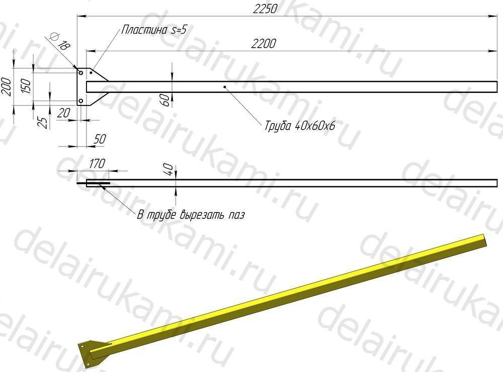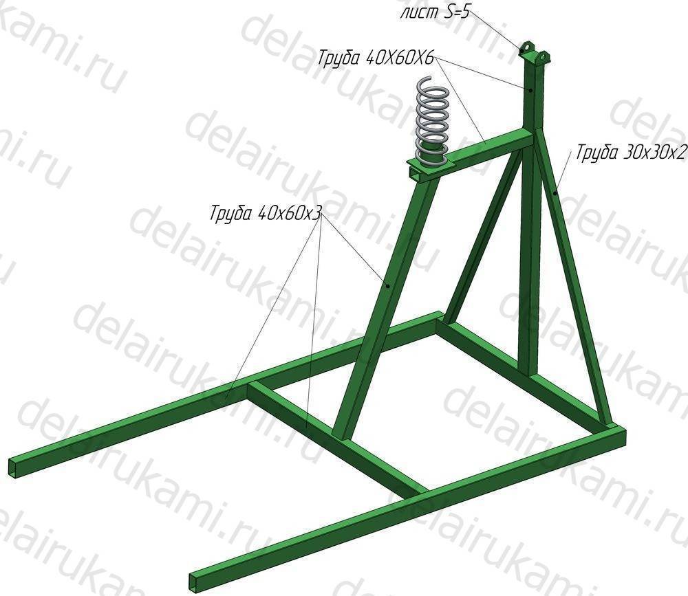На чертежах ниже представлен дровокол на пружине. При его изготовлении все трубы можно заменить на любые другие, главное, чтобы хватило жесткости конструкции. Вместо одной толстостенной трубы сечением 40х60х6 мм можно использовать две трубы сваренные вместе с меньшей толщиной стенки и другого сечения.