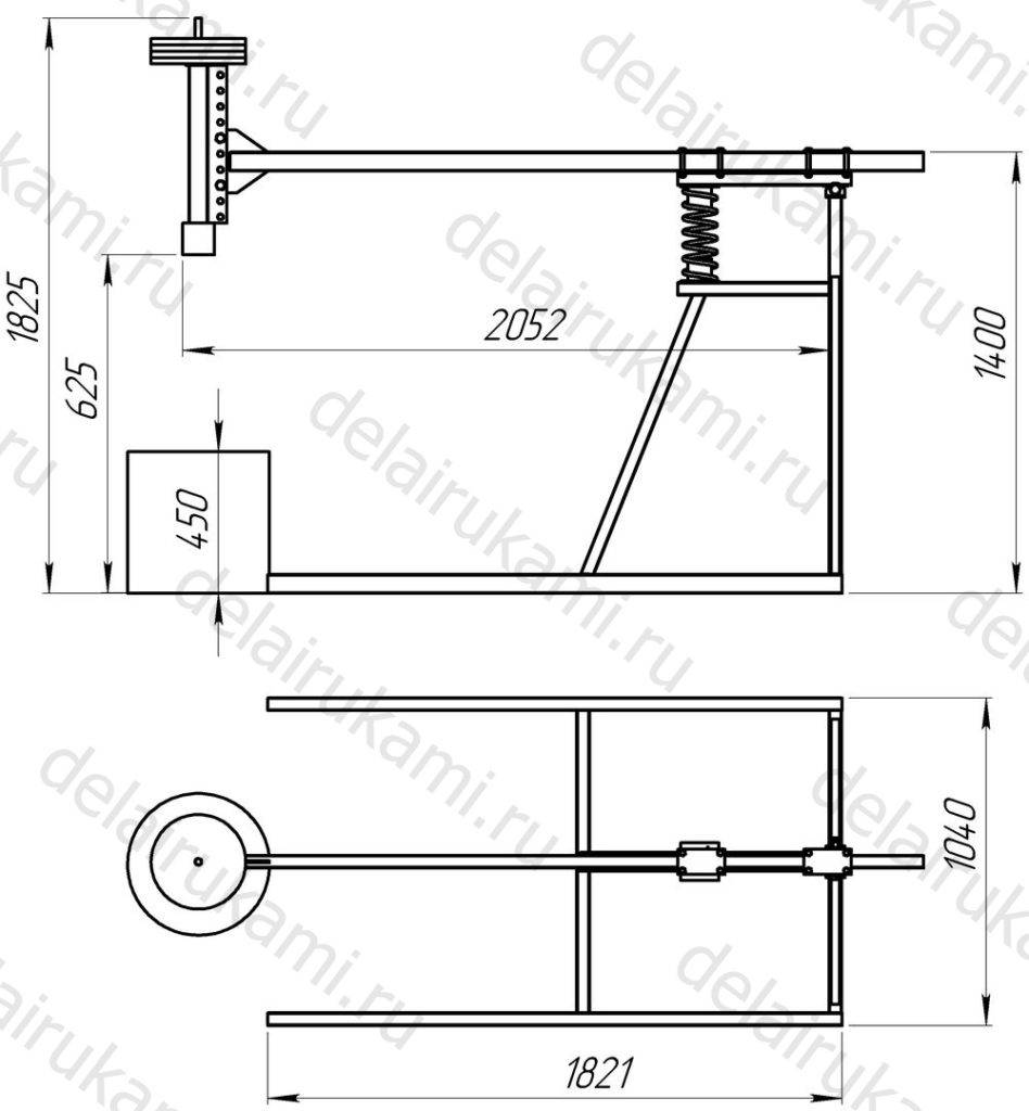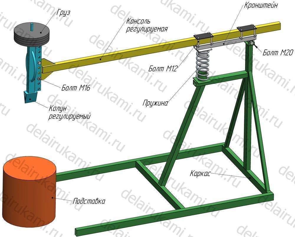 Найти баланс между весом колуна с грузом и усилием пружины поможет регулируемая консоль, чем ближе будет колун к пружине, тем выше будет подыматься консоль.