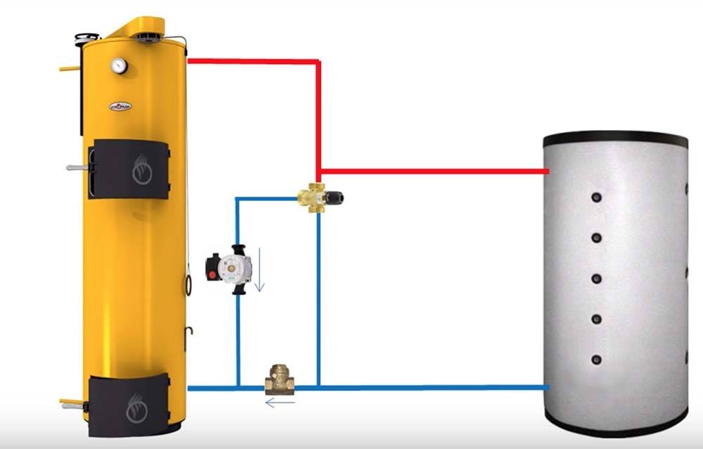 В случае когда нет возможности регулирования интенсивности выработки тепла используется буферная ёмкость, которую часто называют теплоаккумулятором. Его подключают к котлу для того, чтобы в пиковые режимы работы избыточное тепло направлялось на подогрев воды, а затем накопленная энергия расходовалась в целях горячего водоснабжения или отопления.