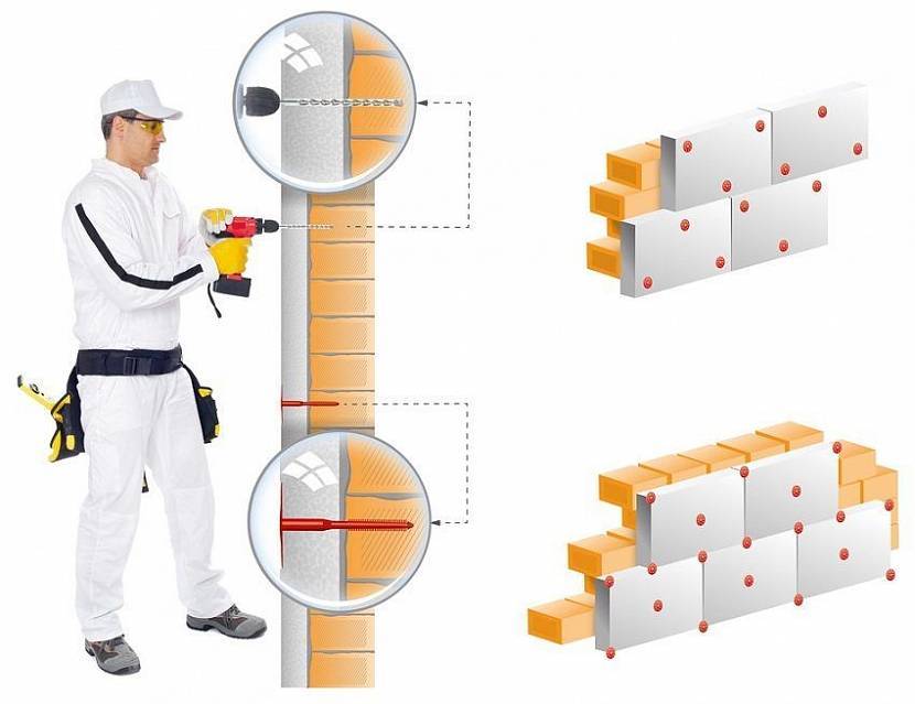 - С использованием крепежа. Если значимая нагрузка на слой утепления не предвидится, листы крепятся с помощью пластиковых тарельчатых дюбелей. Метод подходит для утепления цоколя или лоджии.