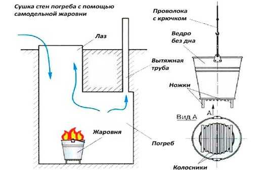 Может быть выполнена при помощи жаровни. Причем при необходимости данный атрибут может быть изготовлен самостоятельно из старого ведра и применяться всякий раз, когда возникает необходимость просушки подвального помещения. Для этого в старом ведре необходимо сделать перфорацию при помощи зубила или топора.