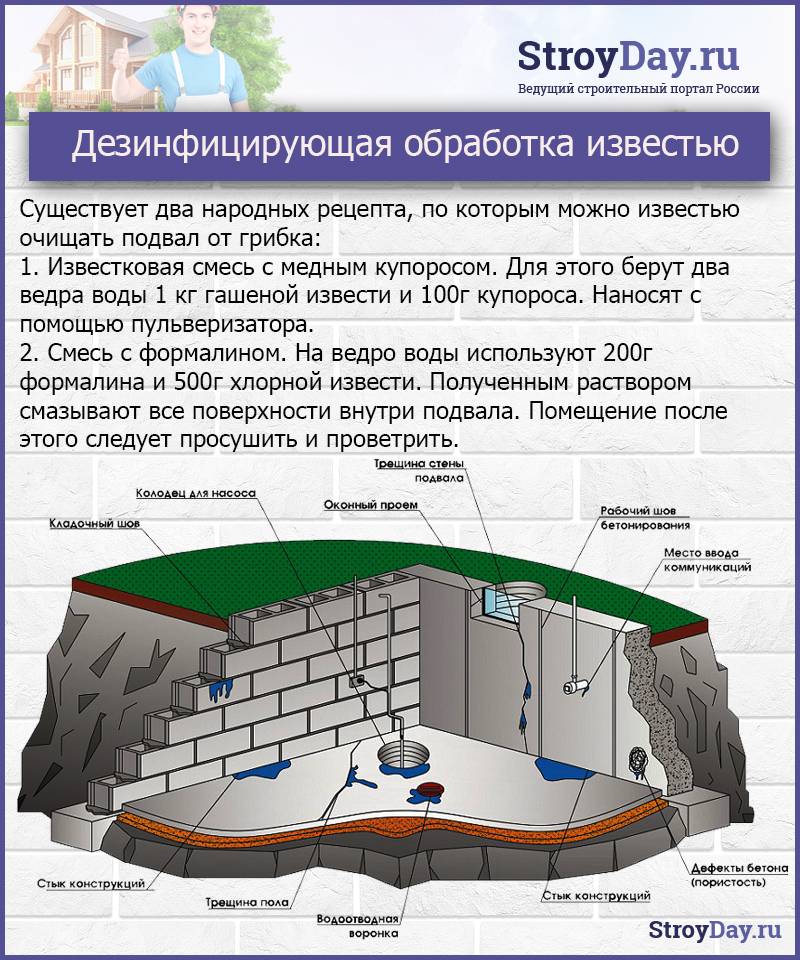 Если нужные меры не были приняты при строительстве дома и перед закладкой овощей в погреб, прежде, чем устранять их, необходимо высушить воздух в подвальном помещении. После этого можно провести профилактические и ремонтные работы по изоляции конструкций и обработку поверхностей.