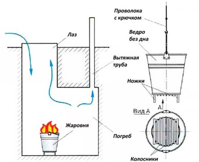 - После прогорания углей, жаровня при помощи веревки удаляется из погреба, а люк закрывается;