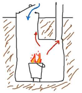 Суть метода: влажность и конденсат испаряются естественным образом, нагретый воздух по закону физики поднимается вверх по вытяжной трубе, закручивается воздухообмен, потому кислород для топки будет поступать через лаз. Дым от дров пропитывает все поверхности, осушая их и подготавливая к дальнейшей обработке.
