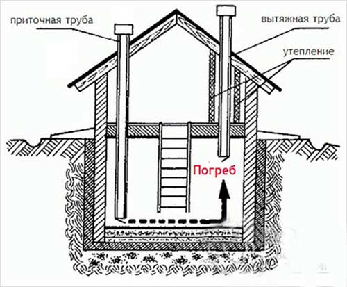 В процессе нагревания, воздух вбирает в себя частички жидкости и поднимается к потолку вместе с ними. При этом холодный воздушный поток опускается на дно помещения. Таким образом, создание вентиляционной системы приточно-вытяжного типа осуществляется исходя из разности температуры воздуха внутри погреба и непосредственно за его пределами.