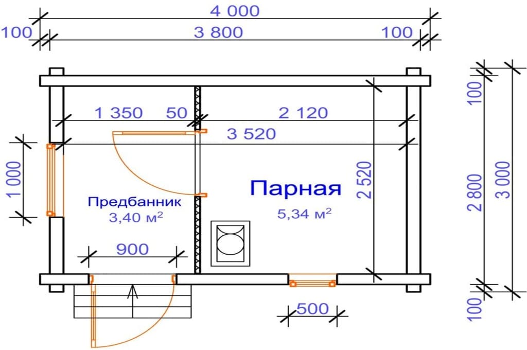 По желанию, чтобы сэкономить строительные материалы, вы можете сделать предбанник отдельно, как пристроенную веранду, тогда внутри достаточно будет места для парилки и моечной: