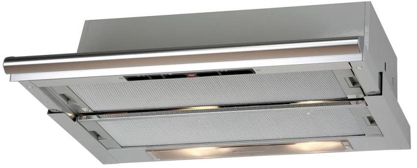 Хорошая бесшумная встроенная вытяжка оснащена тонкой выдвижной панелью. Производительность у модели невысокая, но и сильного гула устройство при работе не издает. Подходит для кухни до 10 м2, разместить приспособление можно над плитой шириной 50 см.