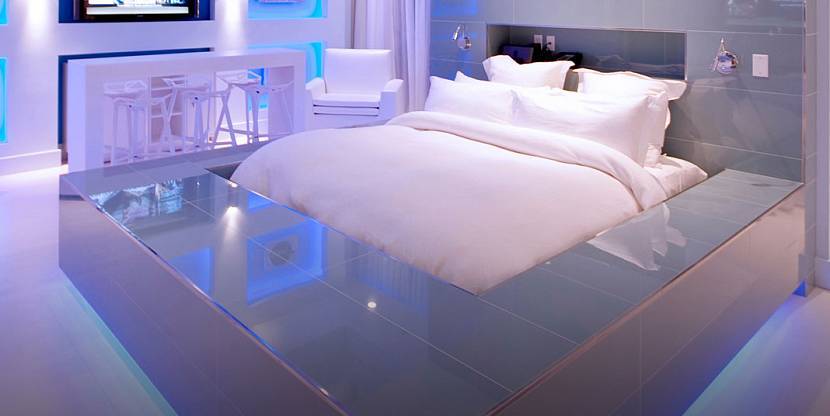 Белоснежные глянцевые полы и стены с синей светодиодной подсветкой напоминают индикацию приборной панели космического корабля.