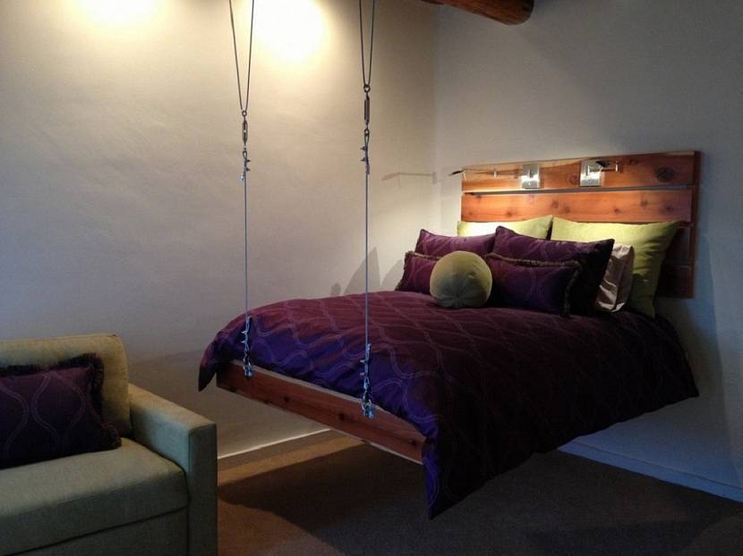 Первое место в рейтинге самых необычных идей для дизайнов спален занимает подвесная кровать на канатах или цепях. Благодаря отсутствию ножек, создается впечатление, что ложе невесомо парит в воздухе: это делает весь интерьер лёгким и свободным.