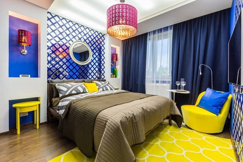 Нетипично и захватывающе выглядит спальня, оформленная в стиле colorblocking. Этот прием предполагает применение в одном помещении множества ярких локальных цветов, образующих контрастные, красочные композиции.