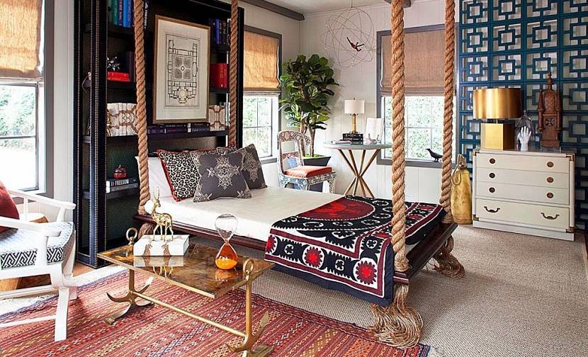 Ложе, закрепленное на цепях, в сочетании с узорчатыми коврами и яркими расписными подушками, наполнит интерьер атмосферой Востока.