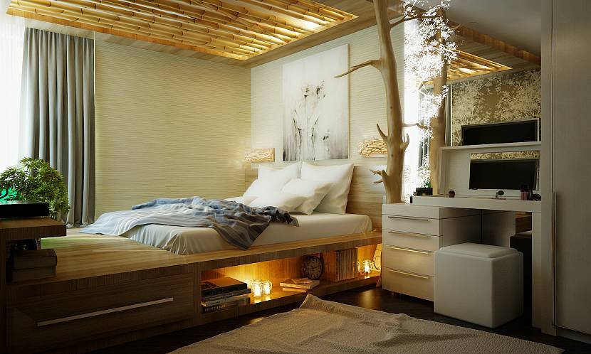 Спальню можно оформить в стремительно набирающем популярность эко-стиле. Для декора используются натуральные материалы: круглые древесные срезы и цельные сухие деревья, вскрытые лаком, живые цветы в горшках, травяные газоны в длинных ящиках.