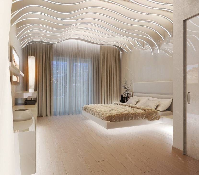 Очень притягательно смотрятся объёмные, фигурные стены или потолок. Можно установить рельефные панели в форме волн и добавить между гребней подсветку, подчеркивая их рельефность и глубину.