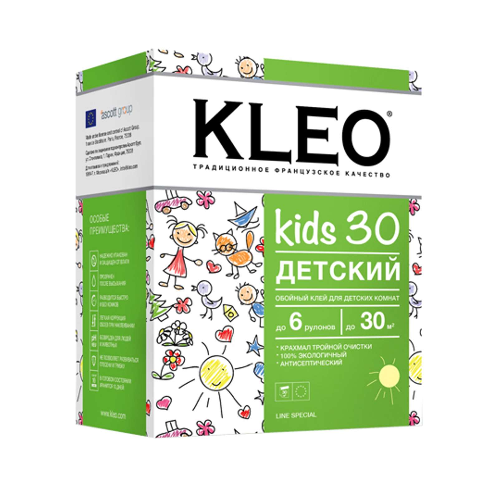Kids, по названию ясно, что клей создан для работы в детских комнатах. Имеет нейтральный уровень рН. Может использоваться с любыми видами полотен. Готовый состав можно наносить на нарезанные листы обоев через 7 минут.