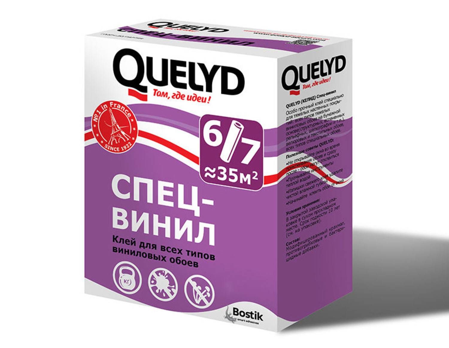 Этот клей для обоев на виниловой основе предназначен и для текстильных покрытий. Представлен в стандартной картонной упаковке, имеет специфический клеевой запах и легко растворим в воде. Срок годности этого средства в закрытой упаковке неограничен, а в готовом виде он может храниться до двух недель. Держится основа стойко даже на тяжелых обоях, но расход Квелед не экономичный, упаковки в 300 гр хватает на 150 кв/м. Примечательно, что наносить Спец-винил на стену можно даже без предварительной грунтовки, а его антигрибковые компоненты защитят от плесени.