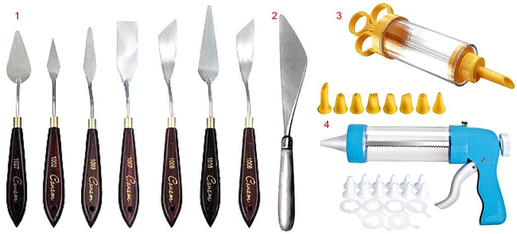 Следующий необходимый инструмент – кондитерский шприц с насадками (поз. 3 и 4) и, возможно, медицинский на 20 мл без иглы. Кондитерский шприц весьма желательно брать с курковым приводом (поз. 4). Смеси для барельефов далеко не так текучи, как крем для тортов, и формировать шприцем веточки, розочки, листики (ну, чем торты разукрашивают, все видели) нужно, держа его 2-мя руками; левой придерживают инструмент у наконечника.