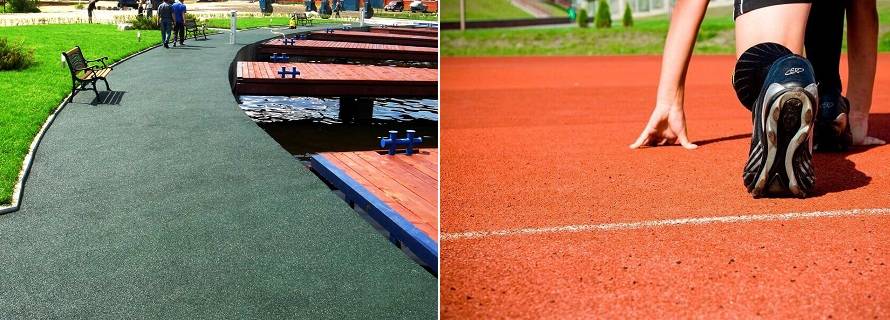 Недостатки: со временем резина набухает, покрытие разуплотняется и крошка выветривается, полотно постепенно разрушается.