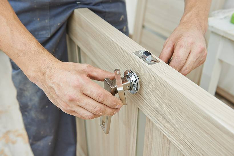 - Врезка замка, установка дверной ручки, крепление наличников и при необходимости доборов.