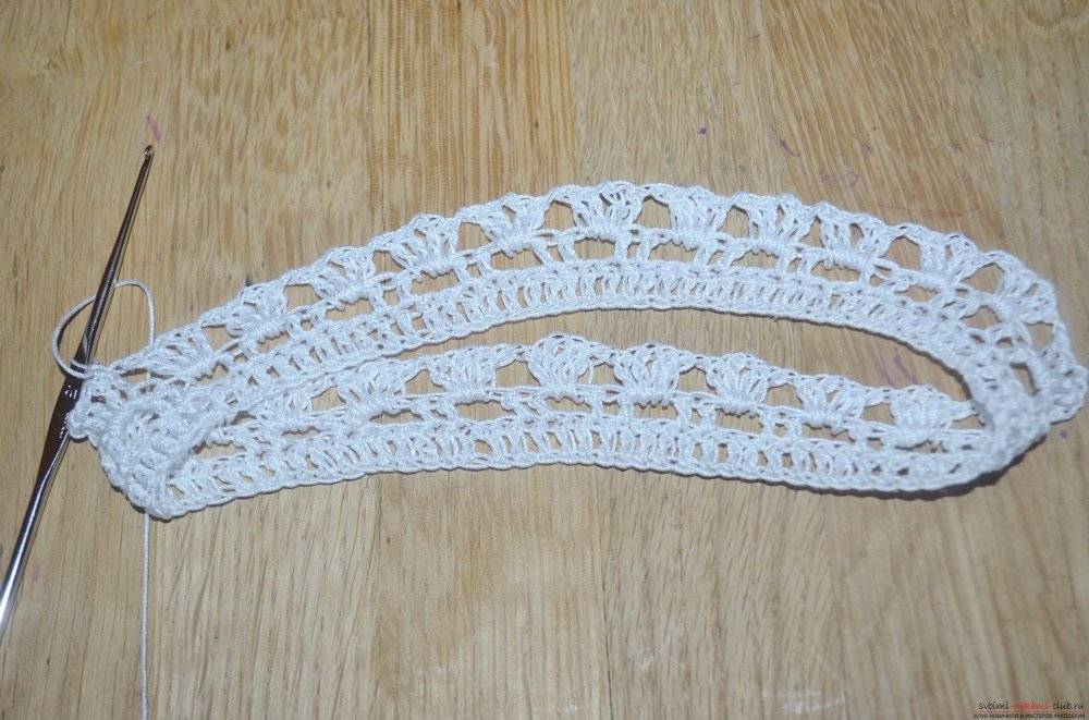 9) Когда абажур будем нужного размера, последний ряд вкруговую обвяжем веерками, таким образом: 1 столбец без накида – 5 столбцов с одним накидом – 1 столбец без накида. По завершении работы изделие обязательно необходимо намочить водой и равномерно потянуть во все стороны, чтобы петельки разровнялись и стали одинаковыми. Кроме того будущий абажур можно слегка накрахмалить.