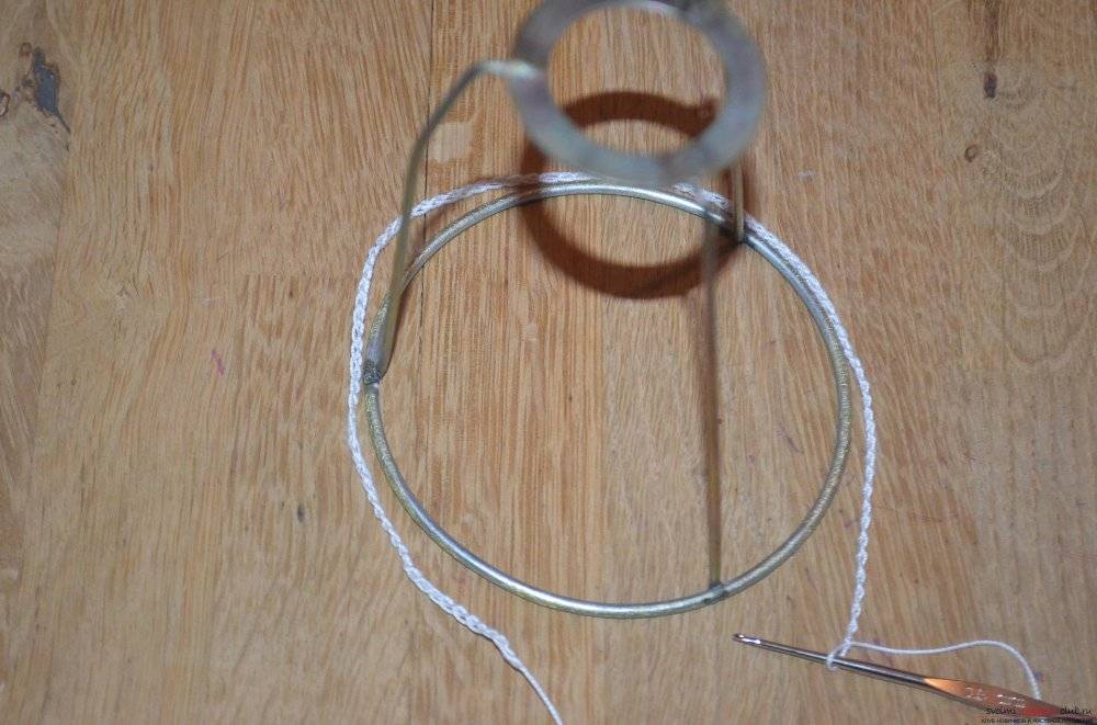 1) Вяжется абажур по кругу. Начнем сверху от узкой части и будем вязать вниз к широкой так, чтобы получился конус. Необходимо, чтобы изделие подходило по размеру, поэтому заранее снимем со светильника проволочную основу, на которой раньше был закреплен старый абажур, и, свяжем цепочку воздушных петель такой длины, чтобы она обхватывала верхнее кольцо каркаса, как показано на фото.