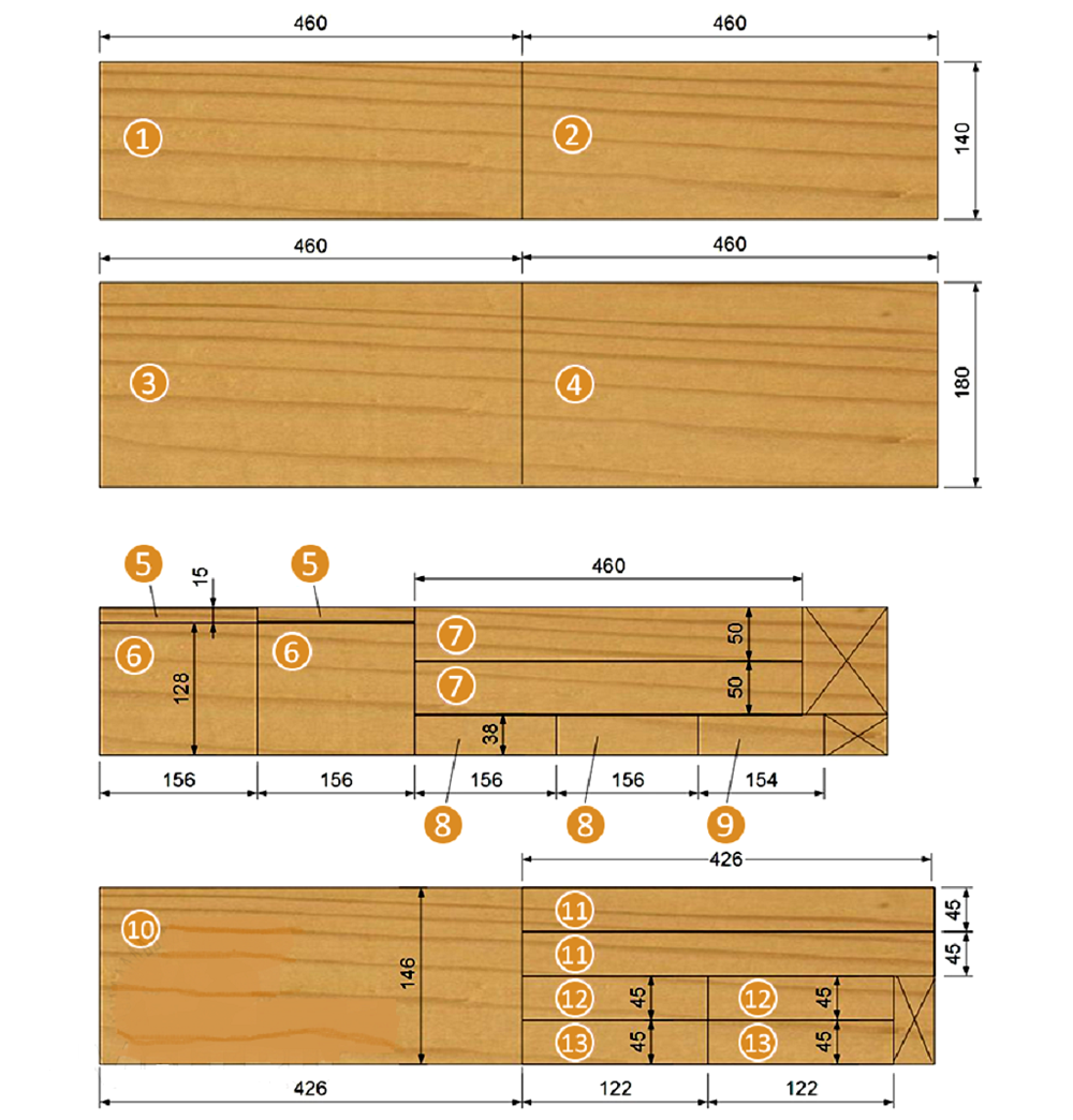 Выполнить разметку деталей на досках по размерам, приведенным ниже.