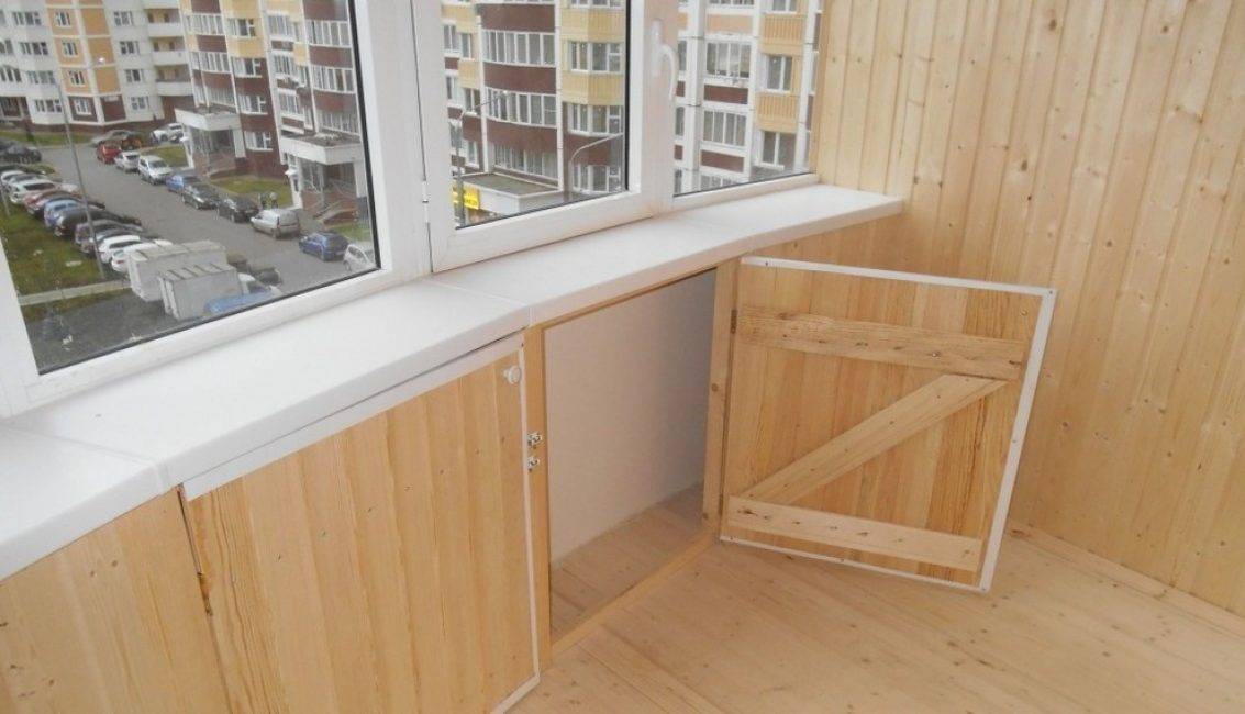 - Вариант 3. В том случае, если балкон застеклен, под широким подоконником, можно сконструировать невысокий и неглубокий (на ширину подоконника) шкаф. Он выглядит уместно и обладает большой функциональностью
