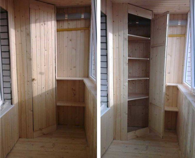 - Конструкции с распашными дверями. Если говорить о самостоятельных работах, то эта модель — самый простой вариант, не обещающий мастеру никаких затруднений. Единственный относительный минус — необходимость оставить пространство для открывания дверок, однако трудно представить себе тот балкон, где эта операция вызвала бы сложность.