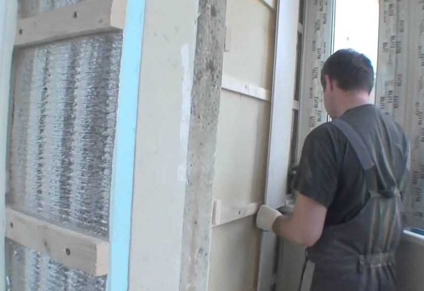 Для утепления стен изнутри сначала крепится пенофол. Сверху – плиты пенополистирола. Стыки проклеиваются алюминиевой лентой.