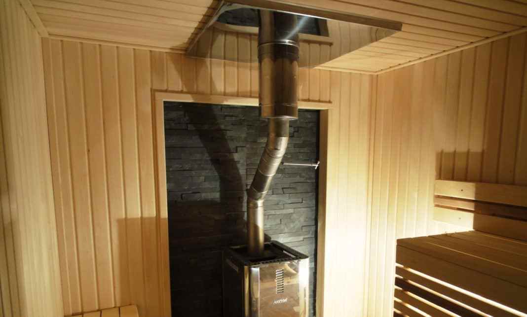 Наиболее практичное расположение печи – топка за пределами парной. В этом случае есть все условия для создания безопасной зоны вокруг нее с помощью металлического листа. Устанавливать каменку следует на кирпичное основание, а проход трубы печи бани через крышу обязательно заизолировать асбестом и другими негорючими материалами, чтобы избежать пожара.