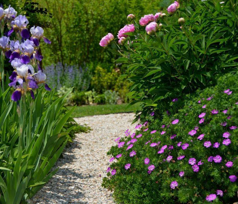 Для ленивой клумбы прекрасно подходят пионы, очиток, герань, астильба, хост и бадан. Добавление астры и флокса украсит клумбу яркими цветами.