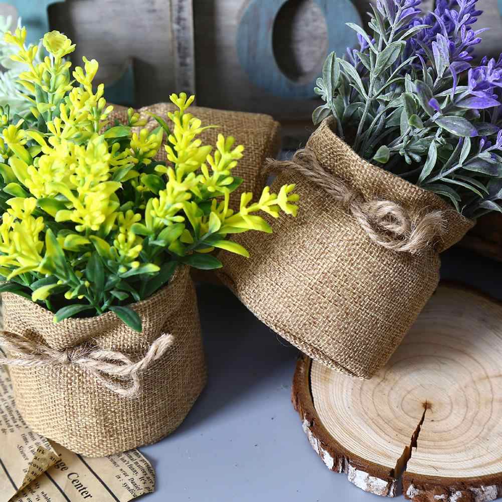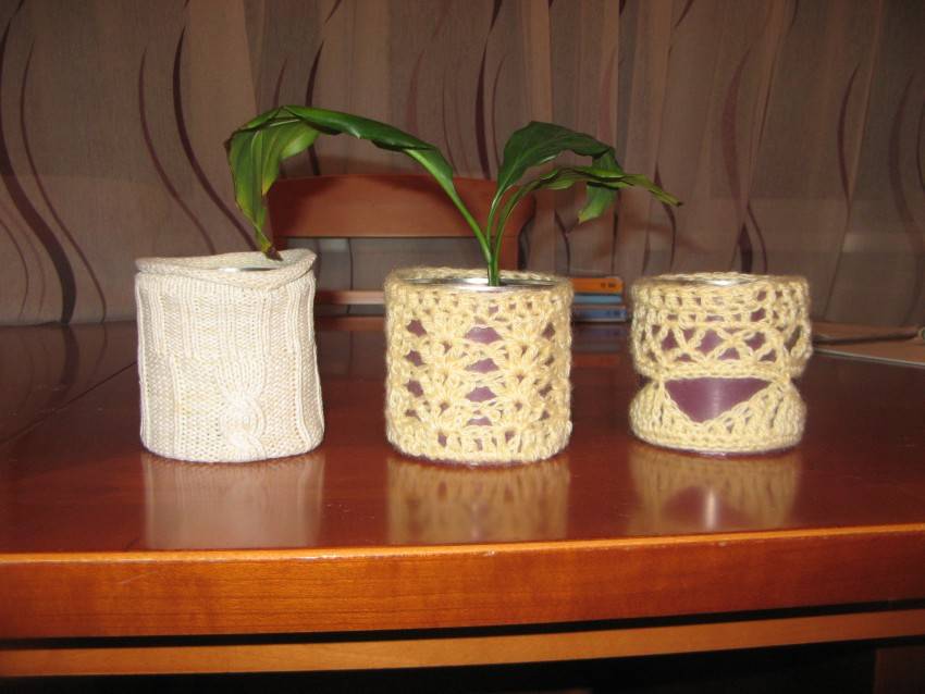 Вы можете обернуть обычный горшок или банку шпагатом. Такой вариант выглядит очень симпатично. Материал для поделки вы можете приобрести в любом магазине «Сделай сам». Отличным вариантом декора станет мешковина, с которой работать еще проще, чем со шпагатом.
