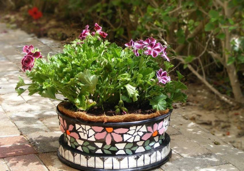 - Вырежьте из тарелок цветных или плитки керамики нужные элементы и приклейте их к горшку. Используйте в работе кусачки.