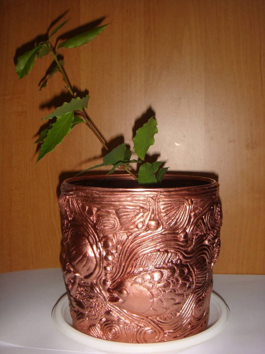 Для работы потребуется кроме непосредственно горшочка, баночки или ведра еще наждачная бумага, жидкость для обезжиривания поверхности (растворители, уайт-спирит, ацетон, жидкость для снятия лака), клей, акриловые краски.