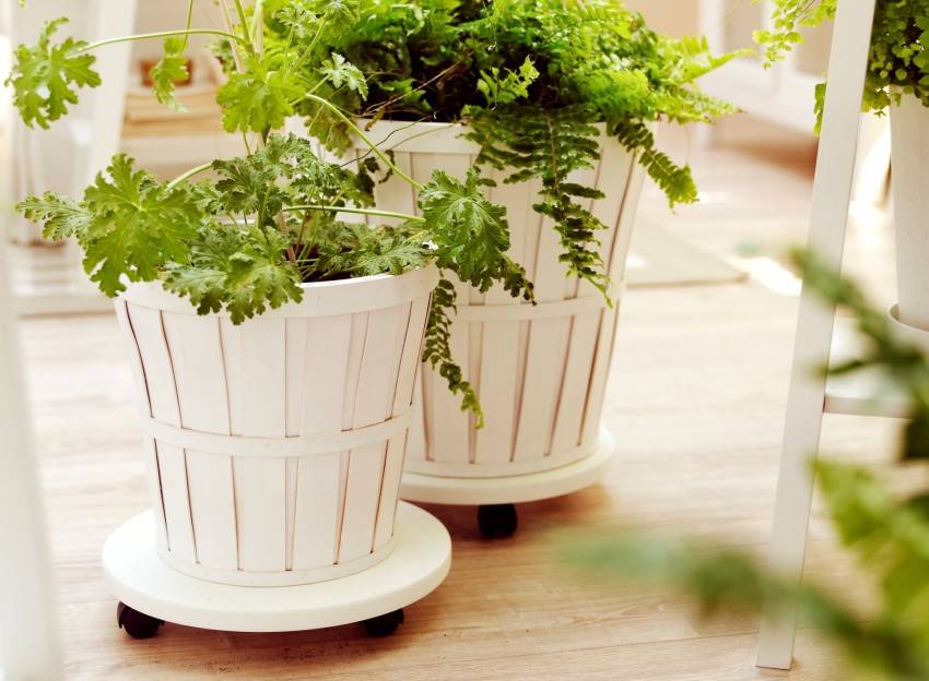 Бетон – тяжелый материал. Среднего размера кашпо будет весить все 15-20 кг. Если в семье нет человека, который сможет спокойно перемещать такой вес, логично задуматься о подставке с колесиками.
