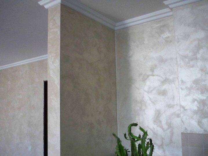 - Венецианское покрытие. К нему примешана мелкая мраморная или ониксовая крошка, благодаря чему создаётся эффект отделки мрамором. Венецианскую штукатурку принято наносить слоями (до 12 штук). Это позволяет создать глубину узора. Стена может получиться глянцевой или матовой.
