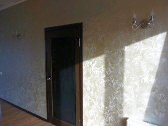 - Жидкие обои. Наиболее простой и быстрый способ декорировать стену. Сухую смесь разводят водой, наносят получившуюся массу шпателем на стену, разглаживают валиком. Реставрировать или убирать такое покрытие также легко.