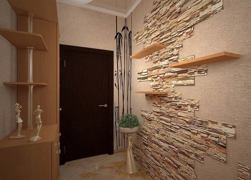 Варианты внутренней отделки стен коридора искусственным камнем могут быть разными. Декоративный камень в прихожей можно выложить на стене у входа, а также частично на двух смежных стенах. Он может занимать половину стены, располагаясь не только стандартно, но и по диагонали. В зависимости от площади коридора он может быть украшением лишь одного участка либо иметь поддержку на какой-либо из стен.