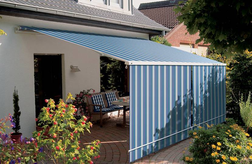 Можно заказать тентованый навес со сматывающейся тканьюИсточник pinterest.ru