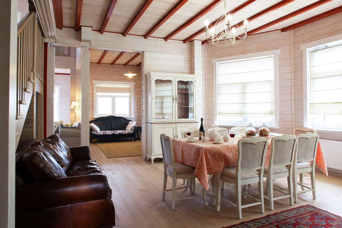 Все приведенные выше четыре фото интерьера домов из бруса основаны на противопоставлении разных цветов. Но внутренние ощущения и впечатления, стиль оформления — разные. Основное — понять, что вам ближе, и на основании этой идеи подбирать сначала цвета стен, пола, потолка, а потом, в полученное помещение, подбирать мебель и аксессуары.
