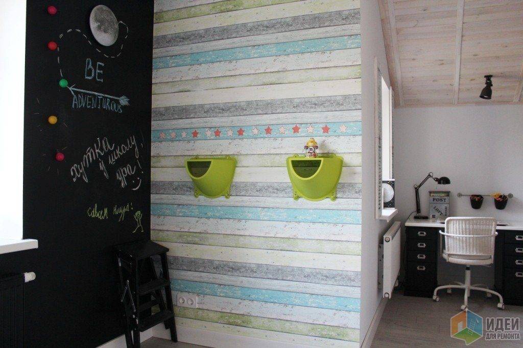 Использование разной отделки помогает не просто акцентировать внимание, но и часто используется в разделении комнаты. Например, около кровати применяются спокойные однотонные обои, а в игровой — цветные с ярким рисунком