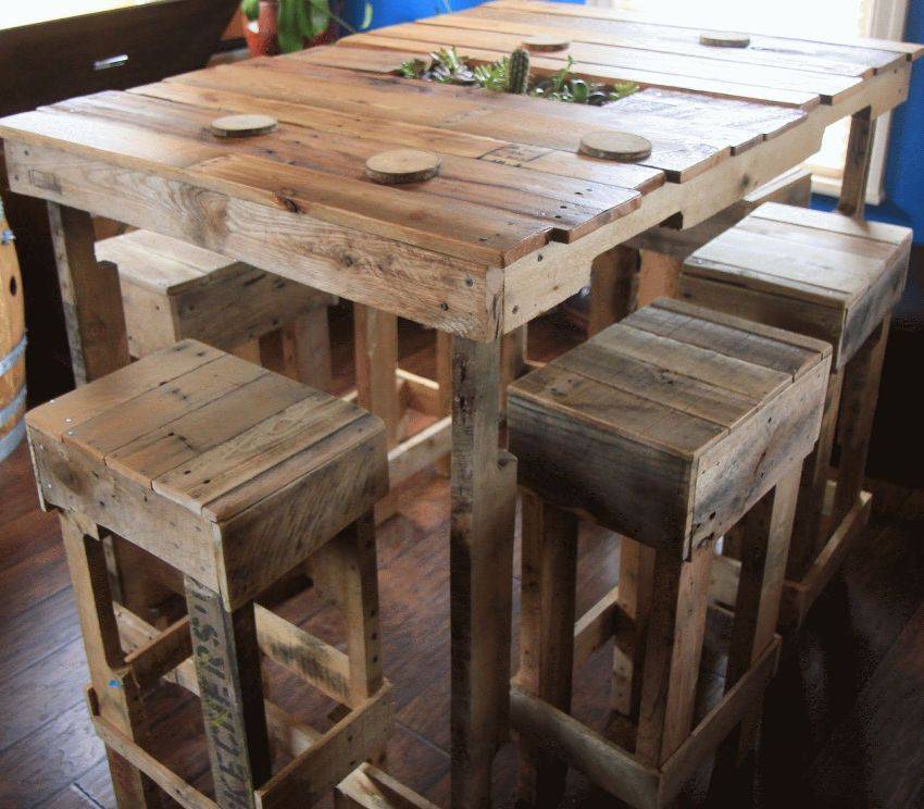 Обеденный стул и высокие табуреты, выполненные из деревянных поддонов