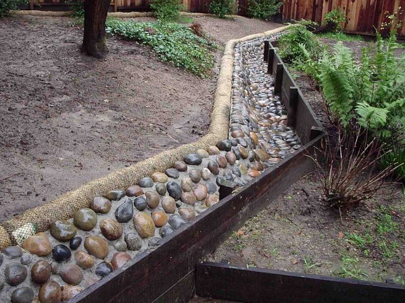 Засыпной дренаж сочетает в себе элементы открытого и закрытого. В определенных местах на участке выкапываются траншеи, которые укрепляются камнями и щебнем. Для этого используются строительные материалы со спадающим размером фракций: на нижних уровнях располагаются камни с большим размером, чем ближе к поверхности – тем фракция меньше. Поверх дренажных траншей насыпается грунт. Такую осушительную систему хозяева часто украшают при помощи водолюбивых растений или прочих декоративных ландшафтных элементов. Последний вариант не рекомендуется использовать на болотистых почвах, т. к. он очень быстро заливается водой.