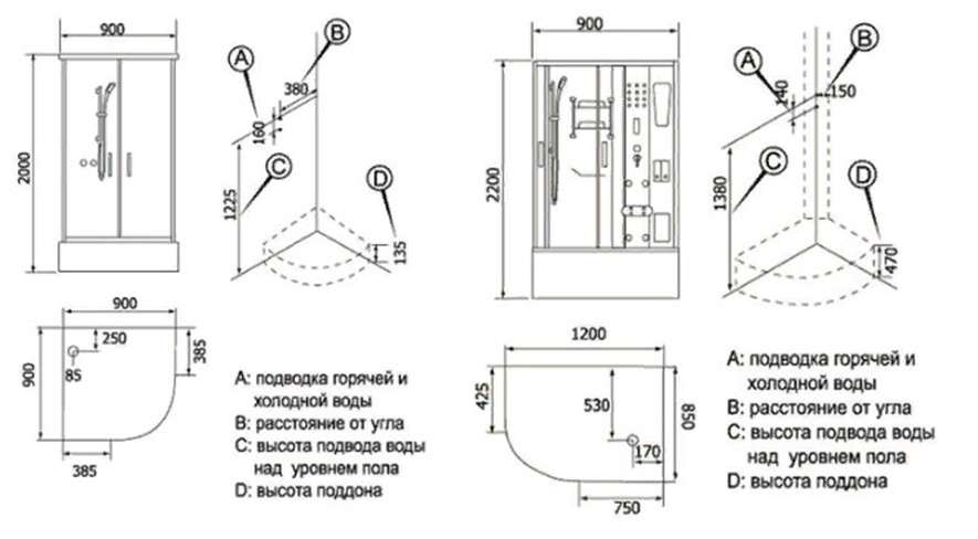 Ниже представлены варианты чертежей нескольких типов кабин, в зависимости от формы и высоты поддона.