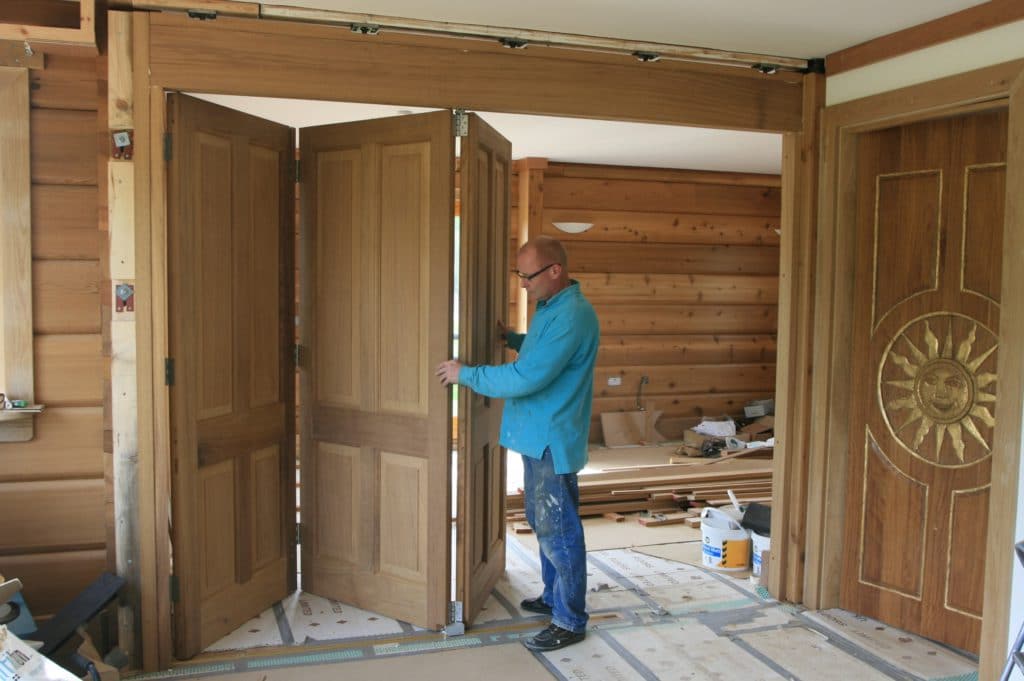 Собрав все створки, соединить их карточными или рояльными петлями. При применении маленьких карточных деталей крепежа потребуется установка 3-4 шт. по высоте каждой пары створок. На верхнюю кромку должен быть поставлен роликовый механизм для легкого скольжения двери. При его отсутствии дверь тоже будет прекрасно работать, но 1 створку можно будет открыть как распашную дверь. При необходимости книжку сдвигают в сторону полностью.