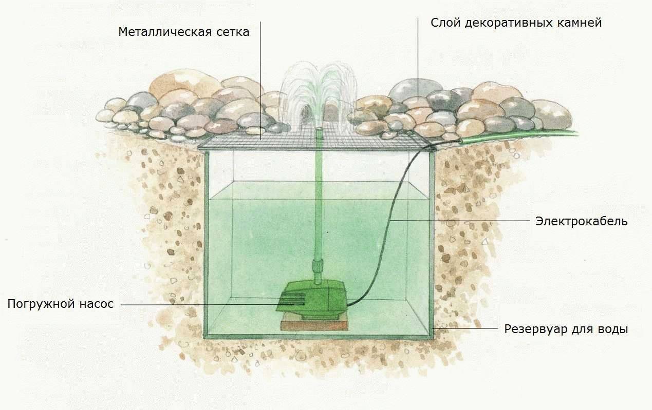 В подобных водоемах используются погружные насосы. Их ставят на дно, установив в корзину с камнями, или просто придавив корпус нескольким валунами. Он забирает воду из емкости, подавая ее в шланг, который крепится к выходному патрубку. Этот шланг и прокладываете к тому месту, откуда будет бежать вода.