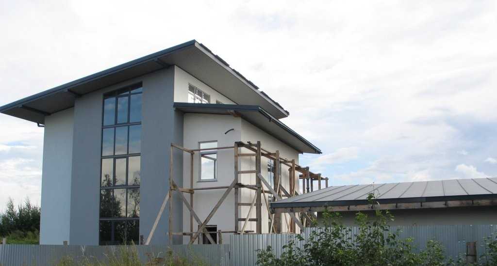 Построен дом в СПб. Проекта не было, была общая идея, которая представлена на фото. Дом из газобетона, финишная отделка — штукатурка, крыша — фальцевая выбрана исходя из дешевизны, надежности, простоты монтажа.