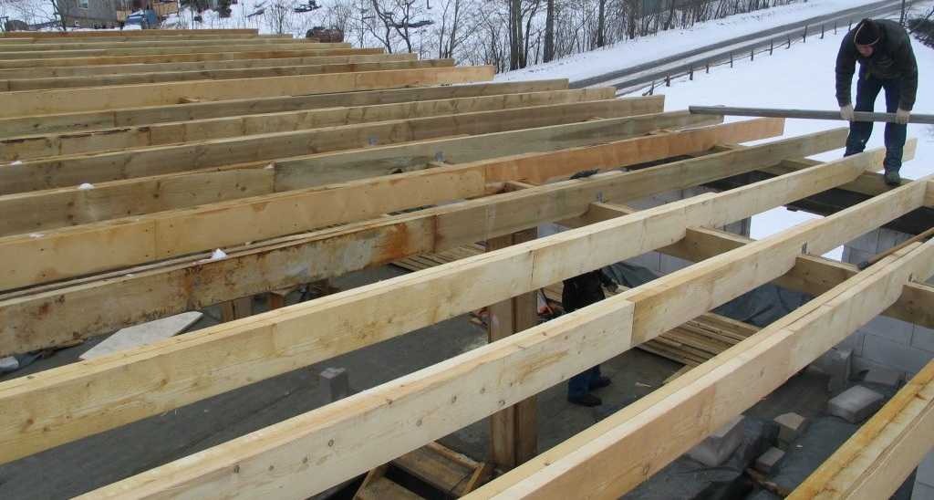 Так как пролет получается большим, поставлены подпорки из бруса (150-150 мм), на которые уложен прогон, который будет поддерживать стропильные ноги.