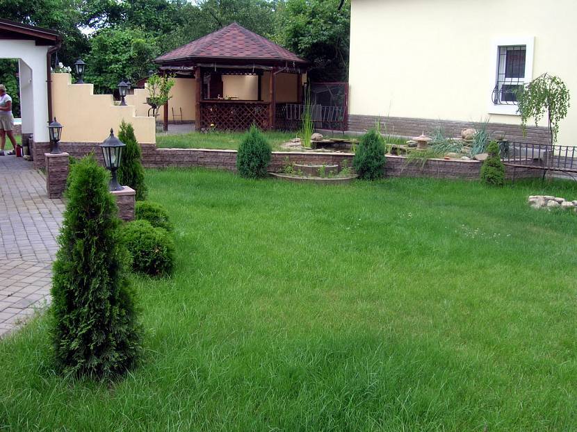 Изумрудная полянка, покрытая шелковистой травой, прелестно подчеркнет достаток и хороший вкус владельцев участка. Но потребует довольно много времени на поддержание очаровательного внешнего вида.
